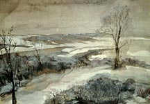 По 1996г.работала по фарфору - литьё и подглазурная роспись. Графическая серия "Сны в начале тумана" предполагает эскизность. Это как бы души деревьев, наша единая плоть с природой - чувство. Пейзажи более закончены. Техника - акварель (сепия), масляная пастель, гуашь.