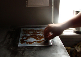 На этот стол кладется подготовленная и обезжиренная ацетоном или 646 растворителем, или чистым спиртом пластина, она должна нагреться до состояния, когда лак при соприкосновении с ней начинает плавится. Тогда расплавляем немного лака об пластину равномерно по всей пластине (просто широким движением нанести несколько полос равномерно по всей длине).